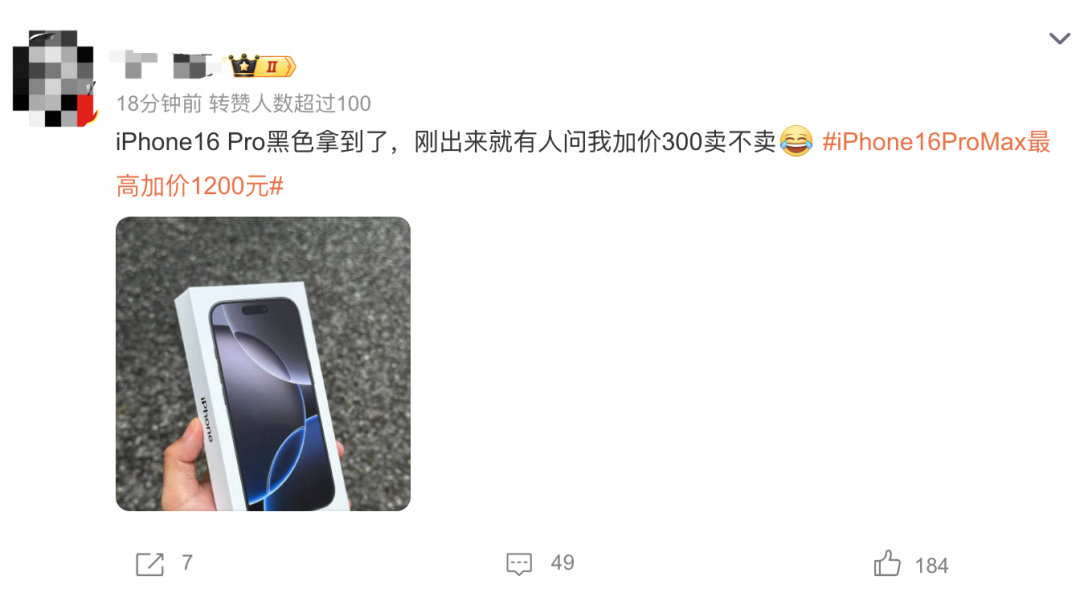 有网友在社交平台表示,“iPhone16 Pro黑色拿到了,刚出来就有人问我加价300卖不卖”。