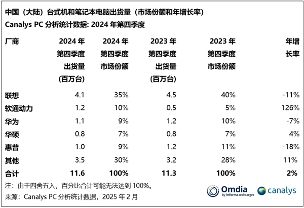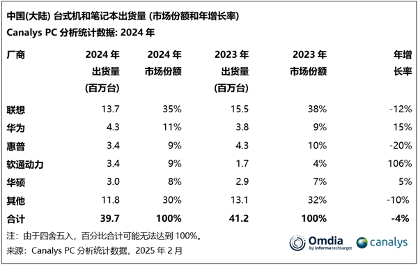 在全年市场份额的排名中,联想以1370万台的出货量和35%的市场份额位居榜首;华为紧随其后,出货量为430万台,市场份额为11%。软通动力与惠普并列第三,两者的市场份额均为9%,而华硕则以8%的市场份额排在第四。