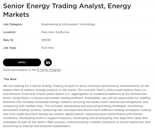 我们正在寻找同时具备工程/分析技能和能源交易专业知识的人。(特斯拉)向可持续能源的过渡正在推进——请帮助我们加速这一进程。”