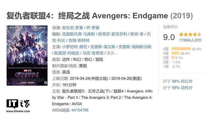 目前《复仇者联盟4:终局之战》的豆瓣评分为9.0分,共有173648人评价,其中5星评价占到了62.8%,1星评价占到0.7%,好于98%的科幻片,好于99%的动作片。