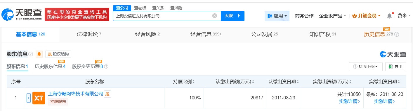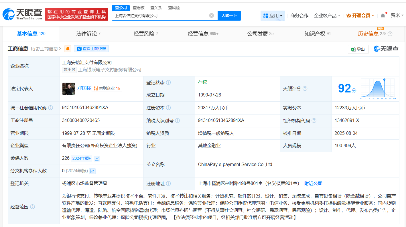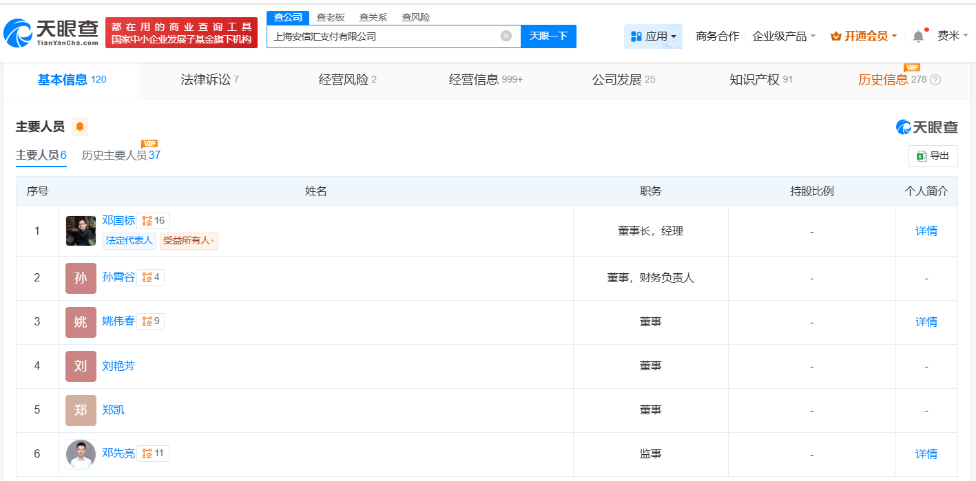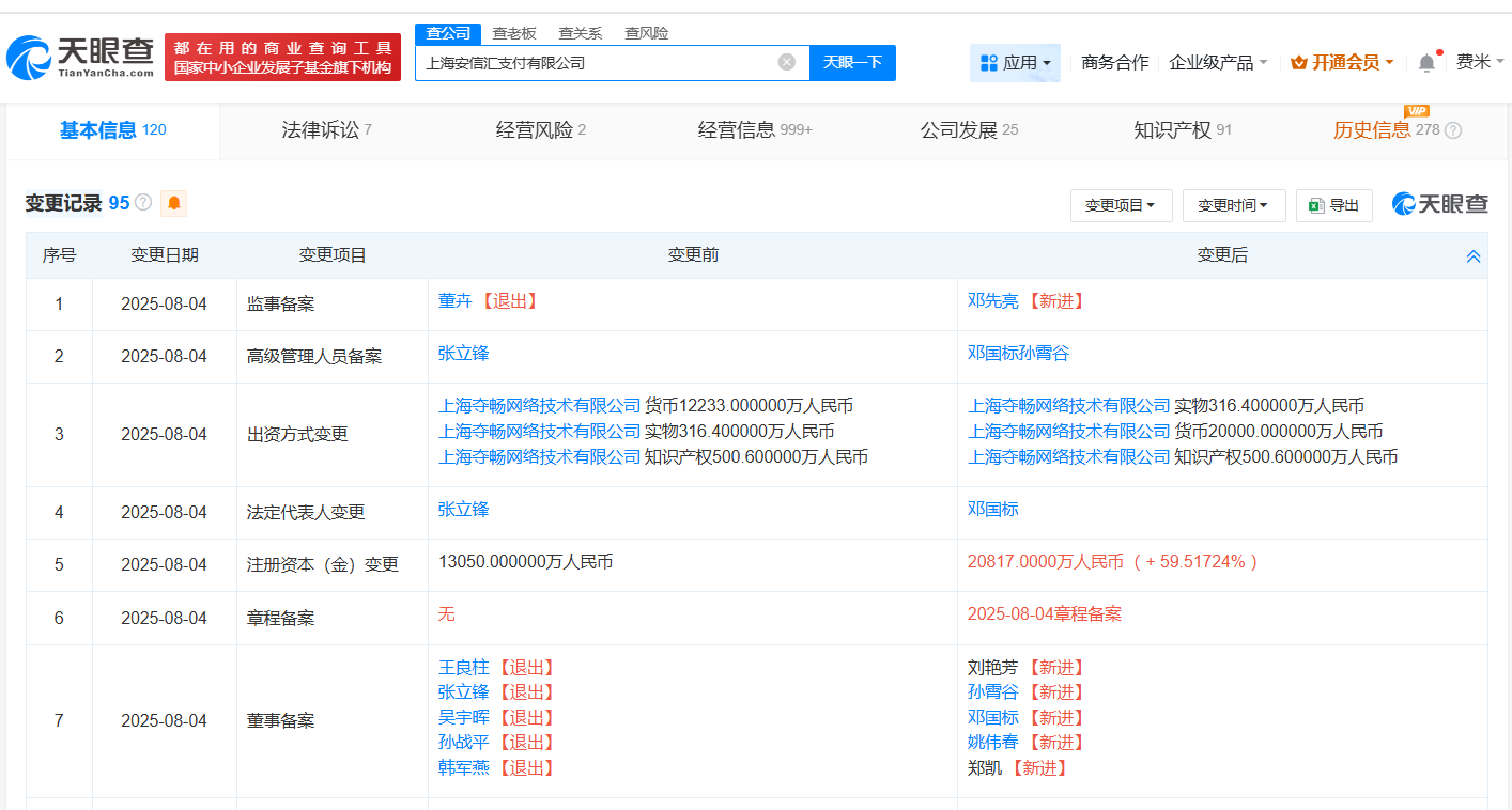 天眼查App显示,近日,上海安信汇支付有限公司发生工商变更,张立锋卸任法定代表人,邓国标接任法定代表人,并担任董事长、经理,注册资本由约1.3亿人民币增至约2.1亿人民币,增幅约60%,同时多位主要人员发生变更。