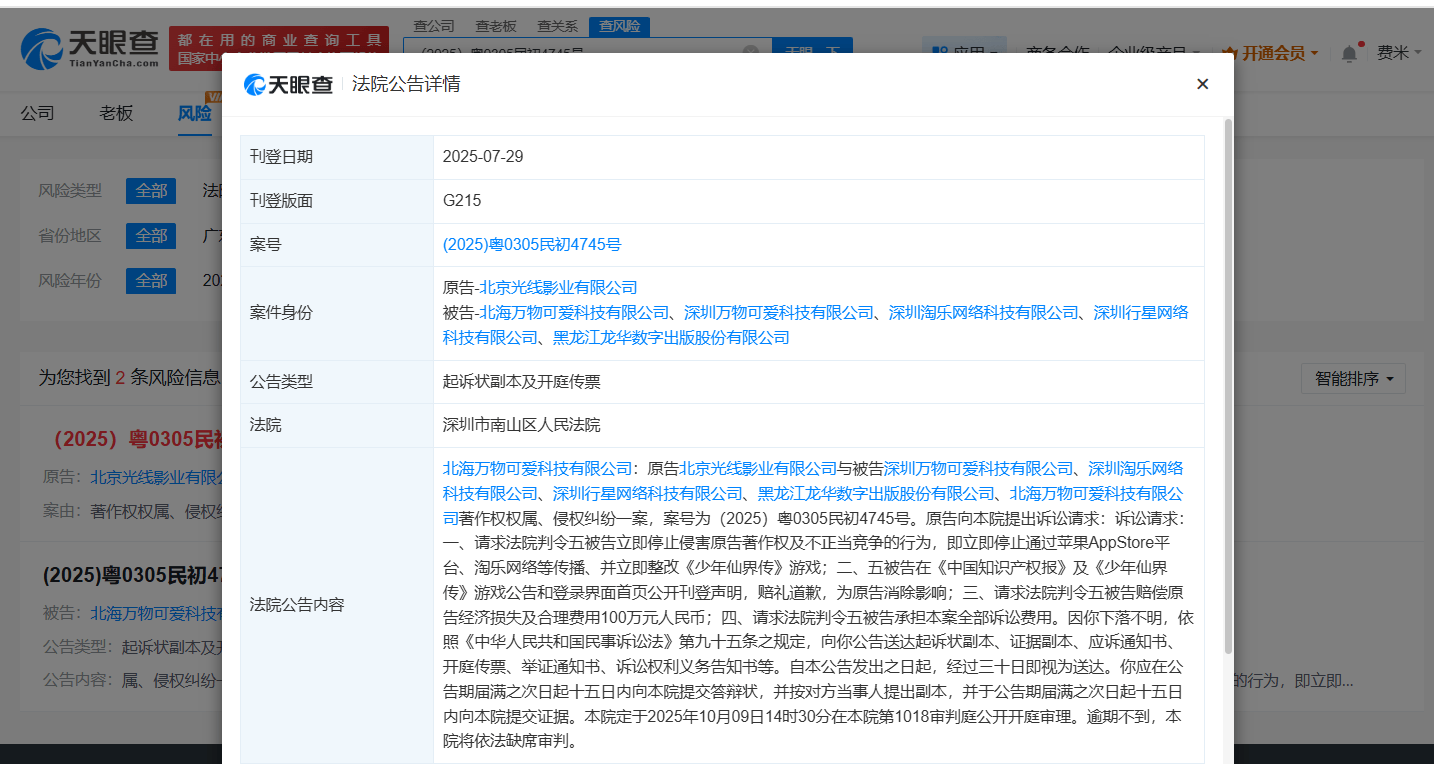 天眼查App显示,近日,深圳市南山区人民法院向北海万物可爱科技有限公司公告送达北京光线影业有限公司起诉其与深圳万物可爱科技有限公司、深圳淘乐网络科技有限公司、深圳行星网络科技有限公司、黑龙江龙华数字出版股份有限公司著作权权属、侵权纠纷案件起诉状副本、开庭传票等。原告请求法院判令被告立即停止侵害原告著作权及不正当竞争的行为,整改《少年仙界传》游戏,判令被告赔偿原告经济损失及合理费用100万元。该案将于10月9日在深圳市南山区人民法院开庭审理。