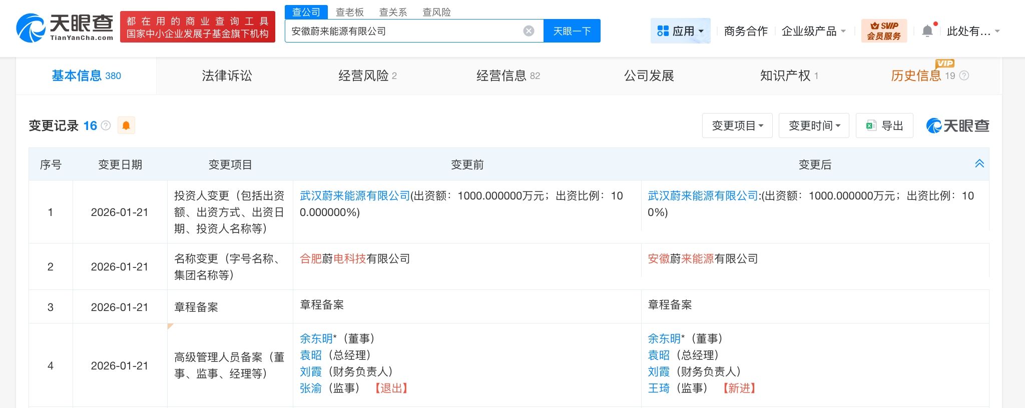 天眼查工商信息显示,近日,合肥蔚电科技有限公司发生工商变更,企业名称变更为安徽蔚来能源有限公司,同时,部分高管也发生变更。