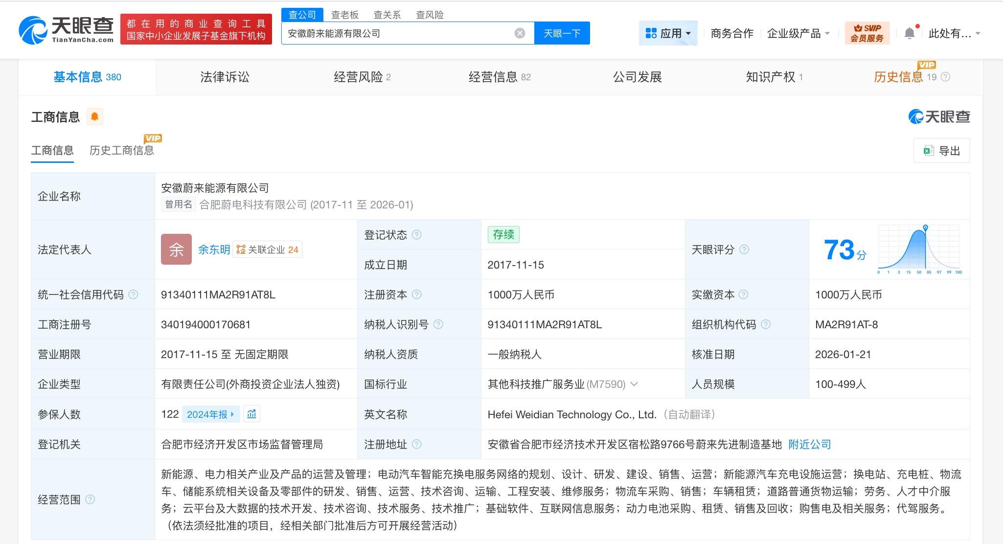 该公司成立于2017年11月,法定代表人为余东明,注册资本1000万人民币,经营范围含新能源、电力相关产业及产品的运营及管理,电动汽车智能充换电服务网络的规划、设计、研发、建设、销售、运营等。股东信息显示,该公司由武汉蔚来能源有限公司全资持股。