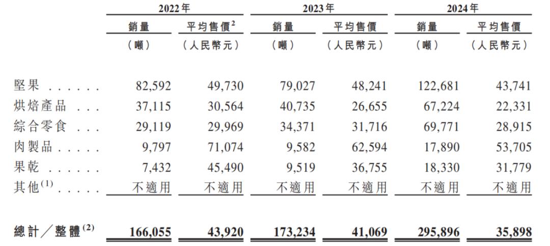其中,核心产品坚果的平均售价从2022年的4.97万元/吨降至2024年的4.37万元/吨,三年降价12.07%。此外,烘焙产品、综合零食、肉制品及果干也分别降价26.94%、3.52%、24.44%及30.14%。