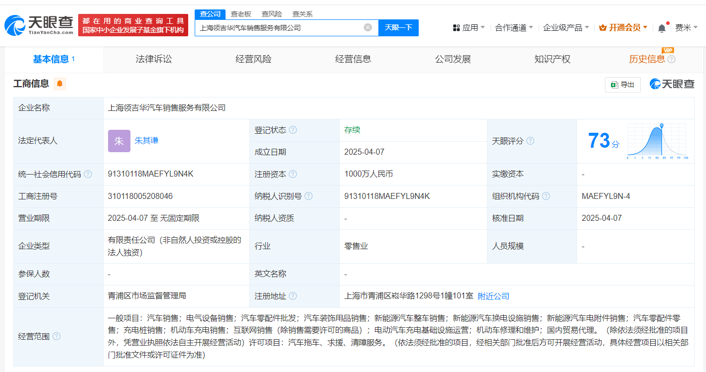 近日,上海领吉华汽车销售服务有限公司成立,法定代表人为朱其谦,注册资本1000万人民币,经营范围包括电气设备销售、汽车零配件批发、新能源汽车整车销售、新能源汽车换电设施销售、电动汽车充电基础设施运营、机动车修理和维护等,由领克汽车销售有限公司全资持股。