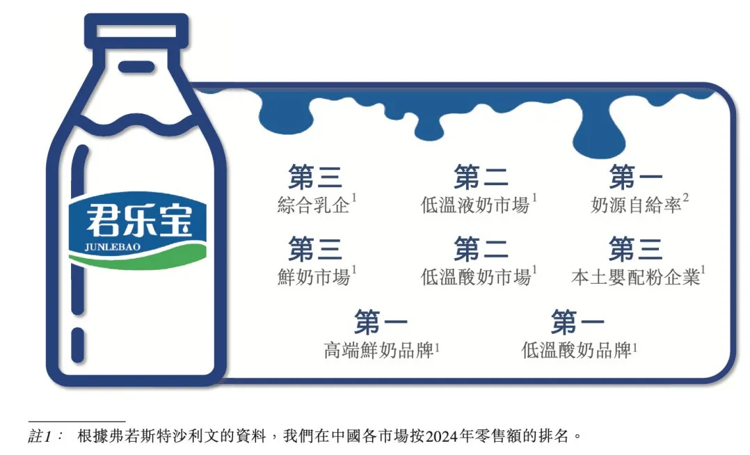 从市场地位看,按2024年中国市场零售额计,君乐宝在国内综合性乳制品企业中排名第三,市场份额为4.3%,位列伊利、蒙牛之后。