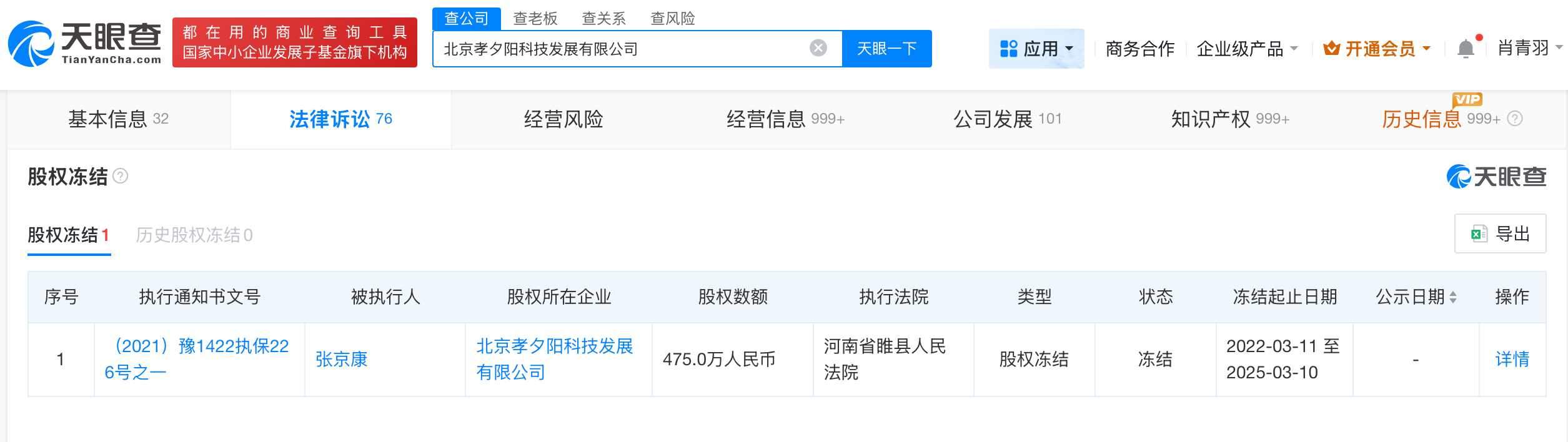 天眼查App显示,北京孝夕阳科技发展有限公司成立于2015年4月,法定代表人为张京康,注册资本500万人民币,经营范围包括零售日用杂货、服装鞋帽、电子产品、家具、体育用品、箱包、厨房用具、工艺品等,由张京康、辛俊兰共同持股。风险信息显示,该公司涉及多起纠纷案件,案由涉及侵害实用新型专利权纠纷、合同纠纷等。此外,张京康所持该公司475万股权已被冻结。