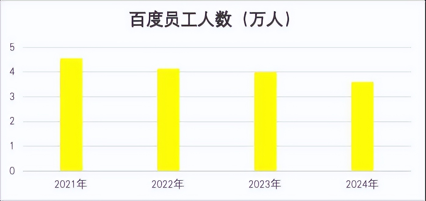 财报显示,截至2024年年底,百度员工总数为3.59万人,相较2023年的3.98万人和2022年的4.13万人,分别减少约4000人、5400人;相较2021年历史峰值的4.55万人,减员近万人,整体降幅超过21%。
