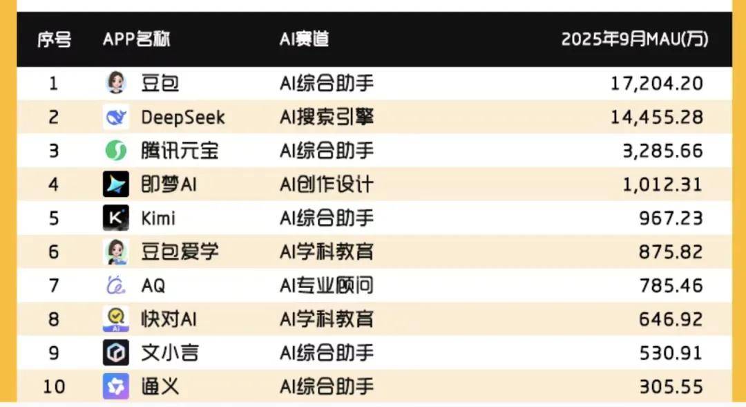 根据AI产品追踪网站Aicpb.com的数据,截至2025年9月,百度文心一言应用的月活跃用户数为1077万,显著低于字节跳动豆宝的1.5亿和深度求索DeepSeek的7340万。