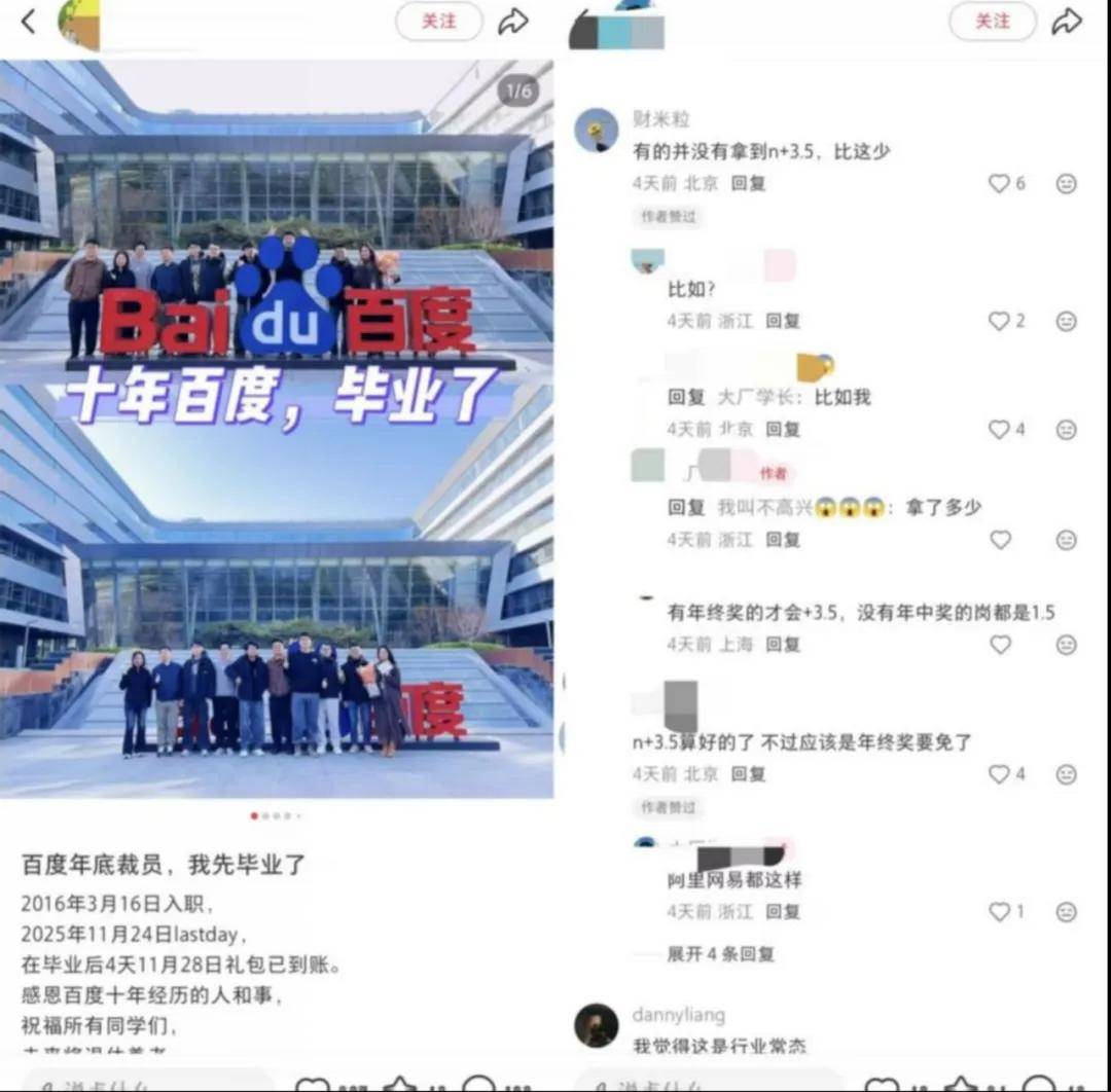 也有自称是25届应届生、仅入职百度3个月的员工在社交平台发文,其在移动生态事业群组部门的赔偿是N+1.5。