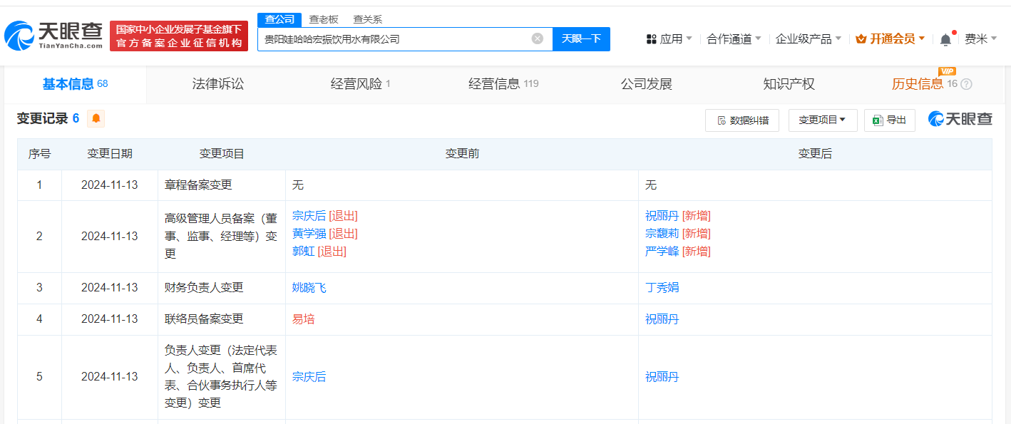 天眼查App显示,近日,贵阳娃哈哈宏振饮用水有限公司发生工商变更,宗庆后卸任法定代表人、执行董事,宗馥莉任董事,祝丽丹任法定代表人、经理,同时多位高管也发生变更。
