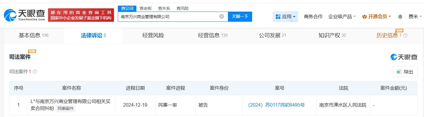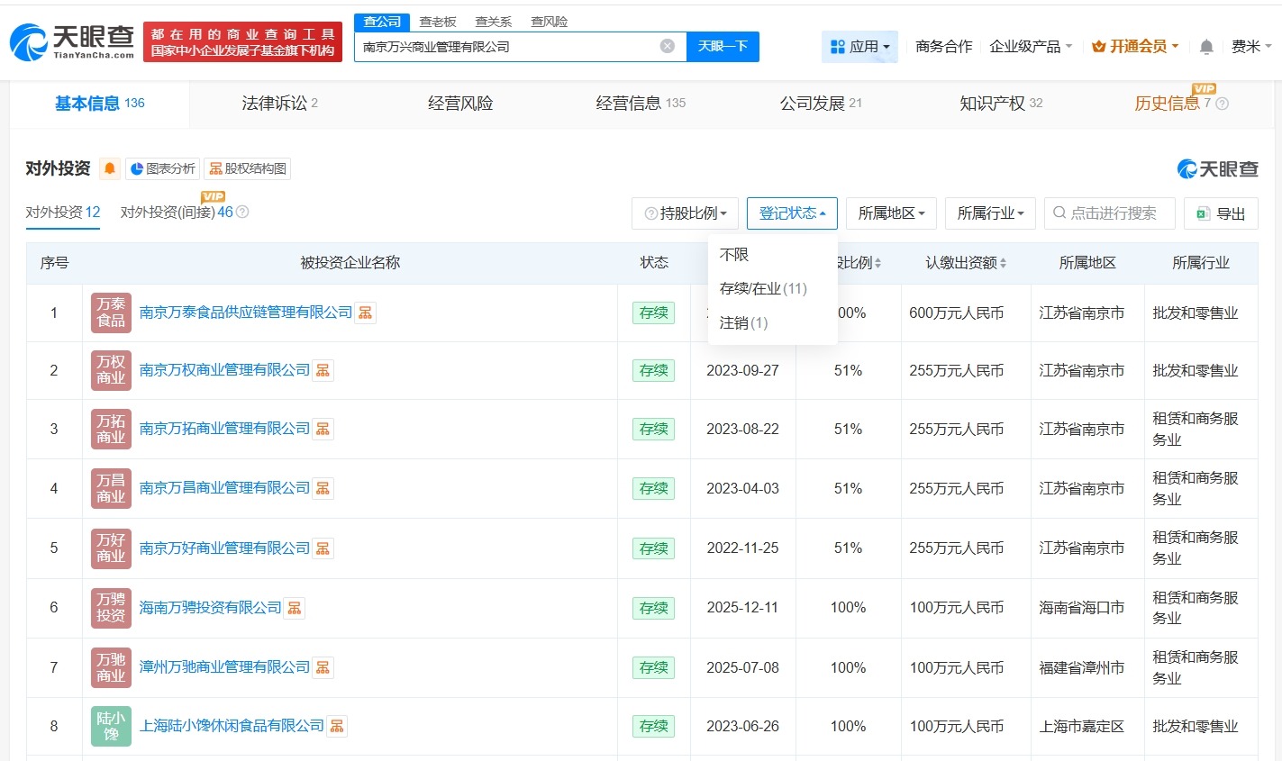 天眼查App显示,好想来关联公司南京万兴商业管理有限公司成立于2022年8月,法定代表人为林该春,注册资本800万人民币,经营范围包括食品销售、企业管理咨询、食用农产品批发、食用农产品零售等,由万辰生物(300972)、王泽宁共同持股。对外投资信息显示,该公司对外投资12家公司,其中11家处于存续状态。法律诉讼信息显示,该公司曾因买卖合同纠纷被起诉。