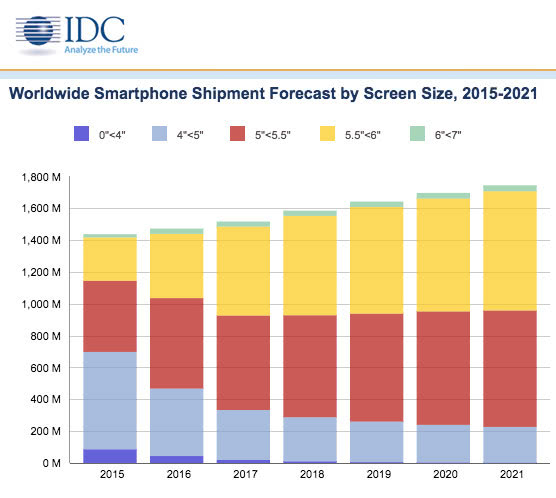 回溯2014年发生过两件大事,这一年在库克领导下的苹果推出了iPhone 6 Plus,正式宣告了从4英寸屏幕,进军5.5英寸的大屏时代。这一年,还是4G商用进程全面启动的一年。从这一年开始,大屏渐渐成为市场主流。根据2017年IDC发布的智能手机市场预测报告显示,5英寸及以下的屏幕占比从2015年不断缩小,来自智能手机大屏化的冲击,和手机同源的平板电脑对用户的吸引力也就逐年下降。