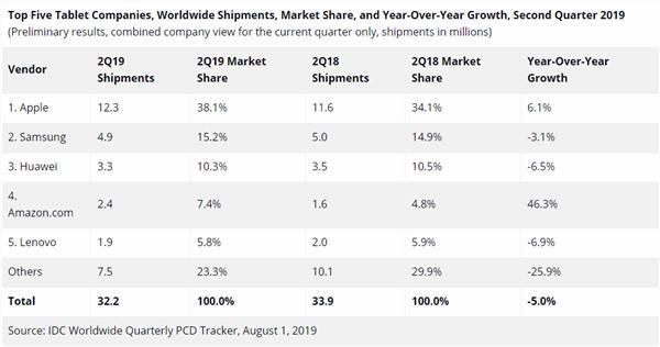 根据IDC发布的2019 Q2平板电脑统计数据显示,全球平板电脑市场前五名的厂商分别为苹果、三星、华为、亚马逊与联想。其中,三星、华为、联想平板电脑大多数都是采用安卓系统,其中三星则以490万出货量,15.2%的份额名列第二,同比下滑3.1%。第三名是华为,出货量330万台, 市场份额10.3%。至于第五名的联想,出货量190万台,市场份额5.8%,同比下降6.9%。
