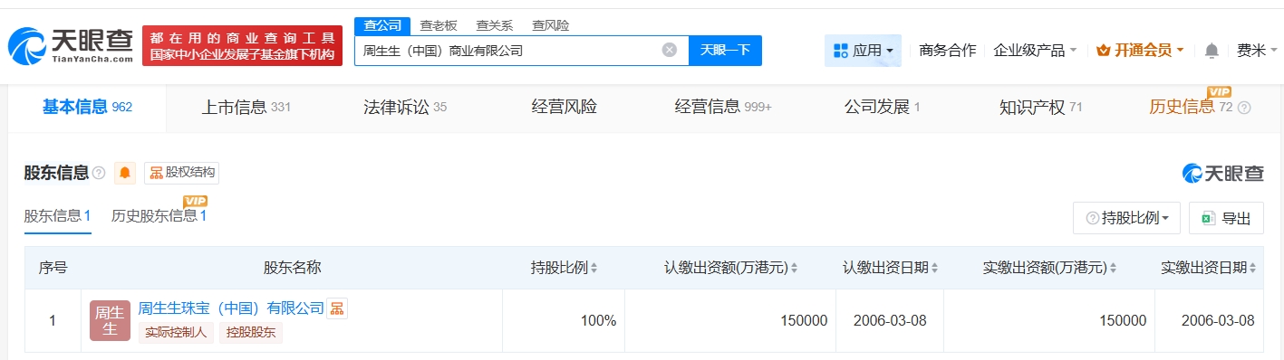 天眼查App显示,周生生关联公司周生生(中国)商业有限公司成立于2006年3月,法定代表人为周永成,注册资本15亿港元,经营范围包括珠宝首饰批发、珠宝首饰零售、金银制品销售等。股东信息显示,该公司由周生生珠宝(中国)有限公司全资持股。法律诉讼信息显示,该公司曾因合同纠纷、买卖合同纠纷被起诉。分支机构信息显示,该公司旗下超200家分支机构已注销。