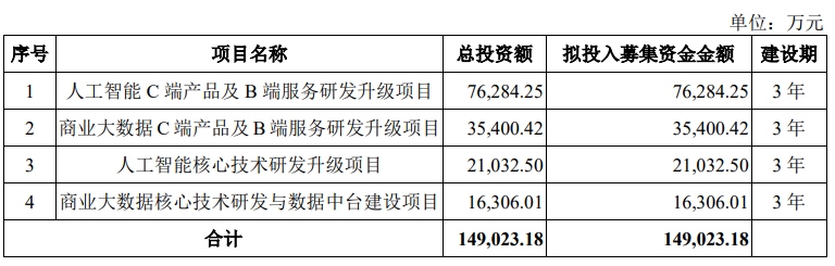 招股书显示,合合信息拟募集资金149,023.18万元,用于人工智能C端产品及B端服务研发升级项目、商业大数据C端产品及B端服务研发升级项目、人工智能核心技术研发升级项目、商业大数据核心技术研发与数据中台建设项目。