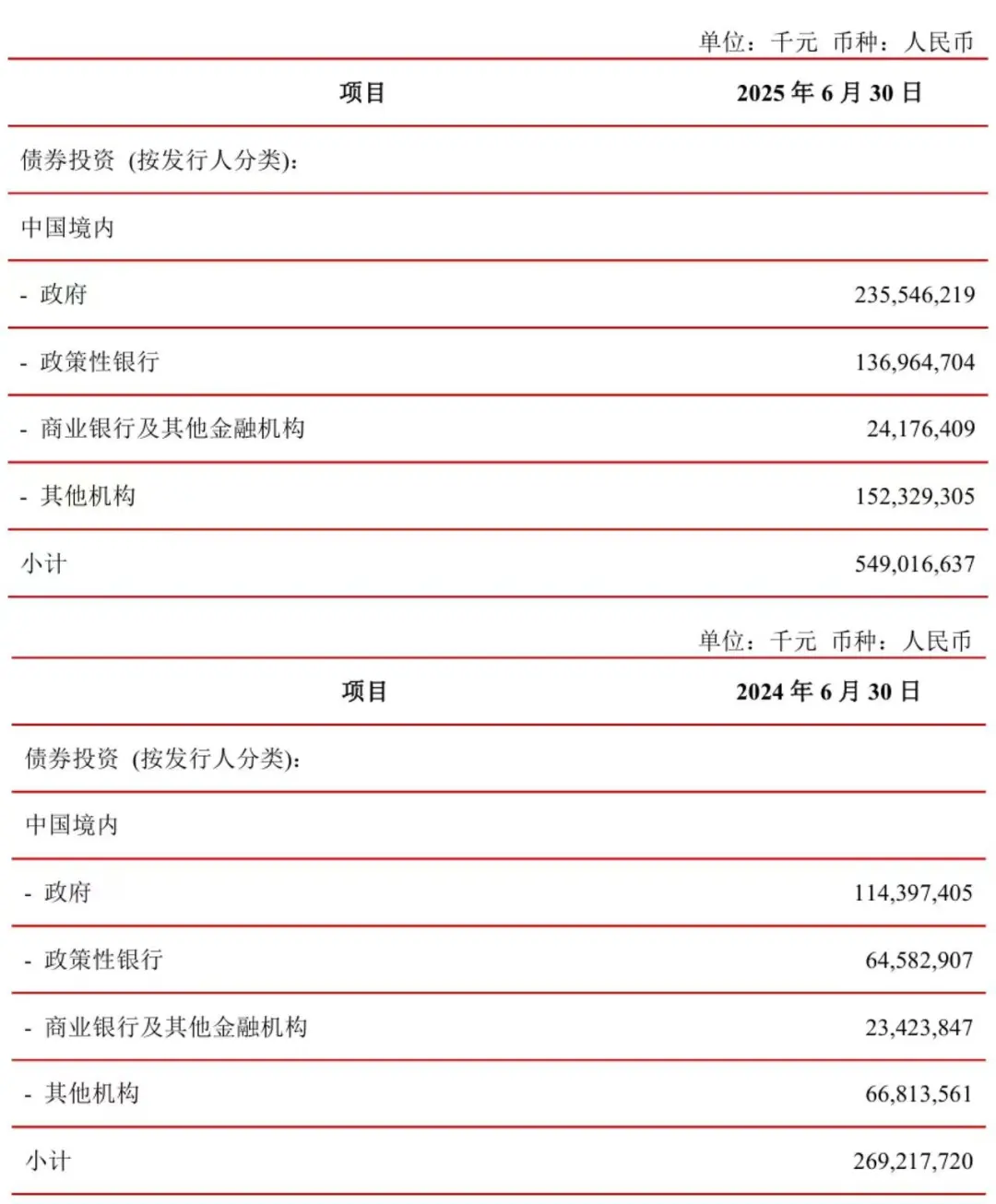 财报显示,“其他债权投资”按发行人分类中,境内其他机构债券由2024年上半年的668亿元增至今年上半年的1523亿元,同比增长128%;同期,境内政府债券由1144亿元增至2355亿元,同比增长106%。“其他机构”是指除政府、政策性银行、商业银行及其他金融机构外的发债主体,主要包括企业和融资平台等。
