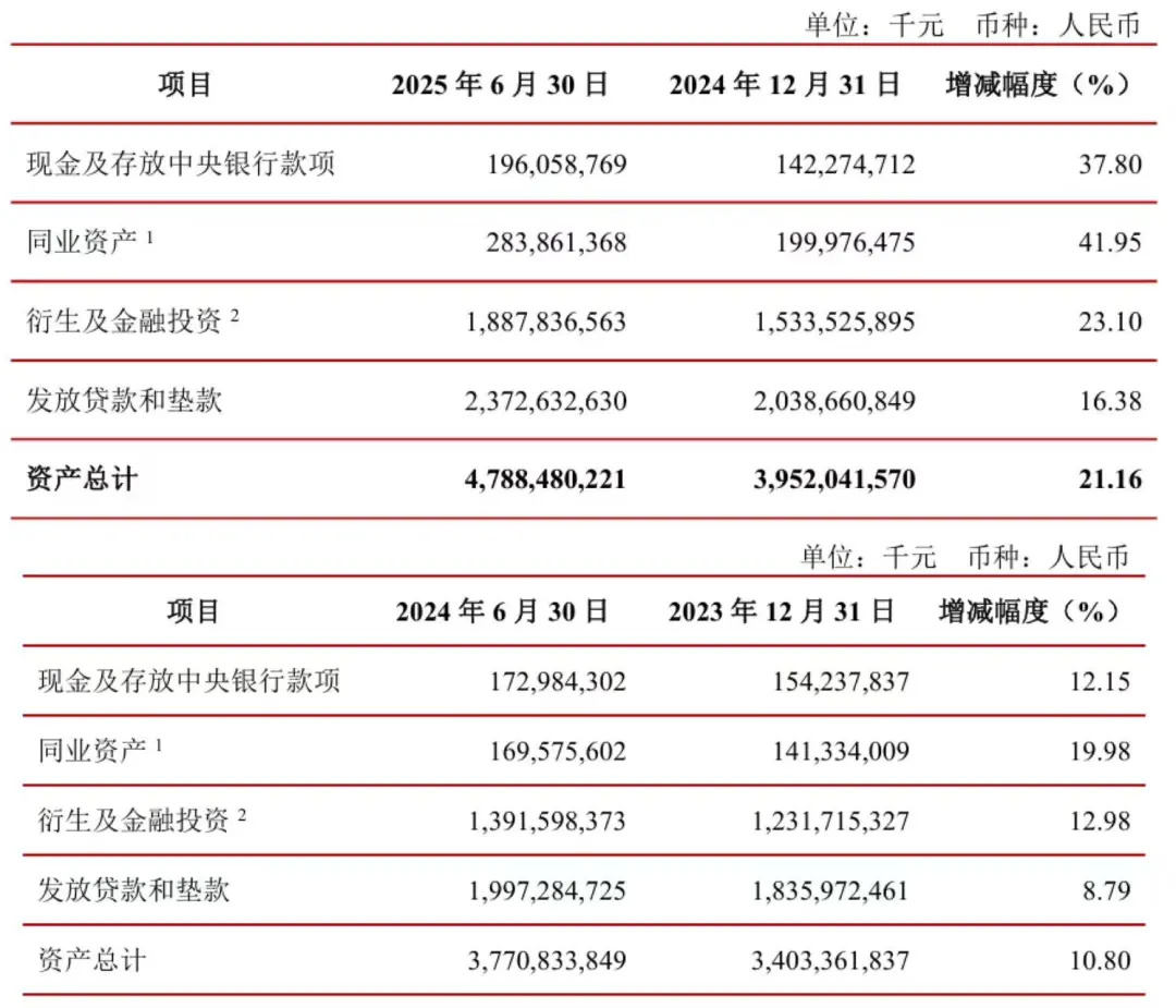 财报显示,2025年上半年末,江苏银行的衍生及金融投资余额为18878亿元,较去年同期的13916亿元增长35.66%,占总资产的比重约为39.42%;同业资产为2839亿元,较去年同期的1696亿元增长67.39%,占总资产的比重约为5.93%。