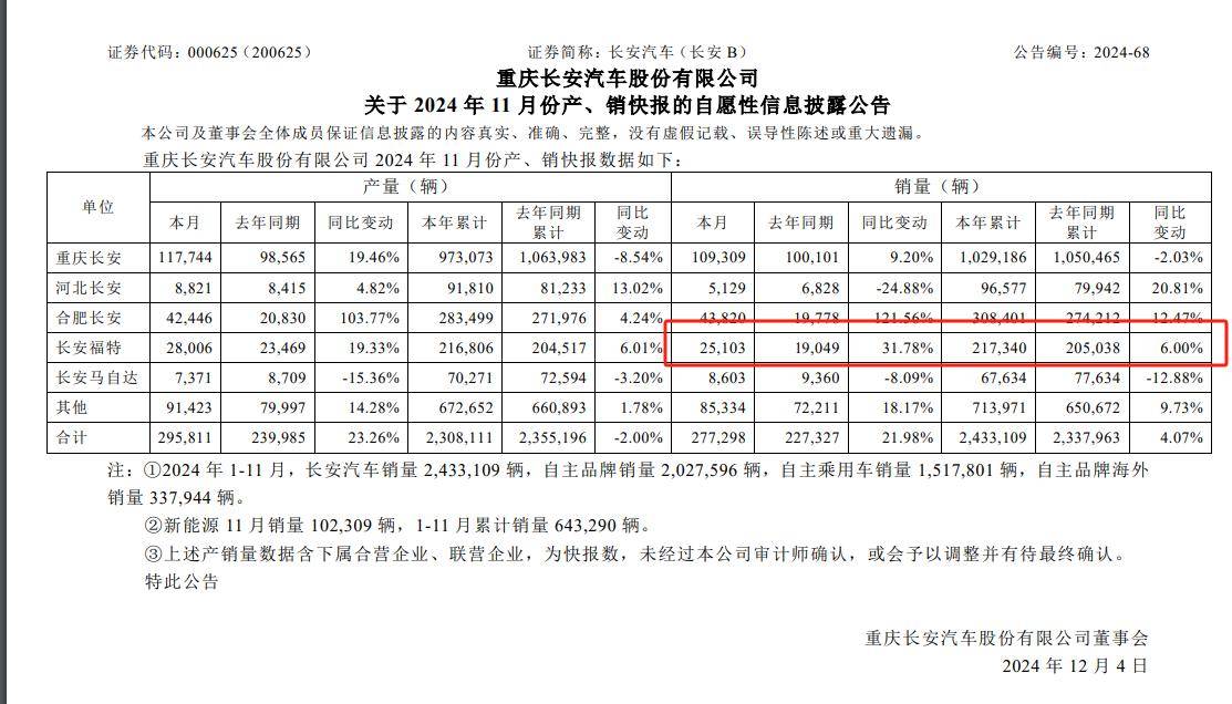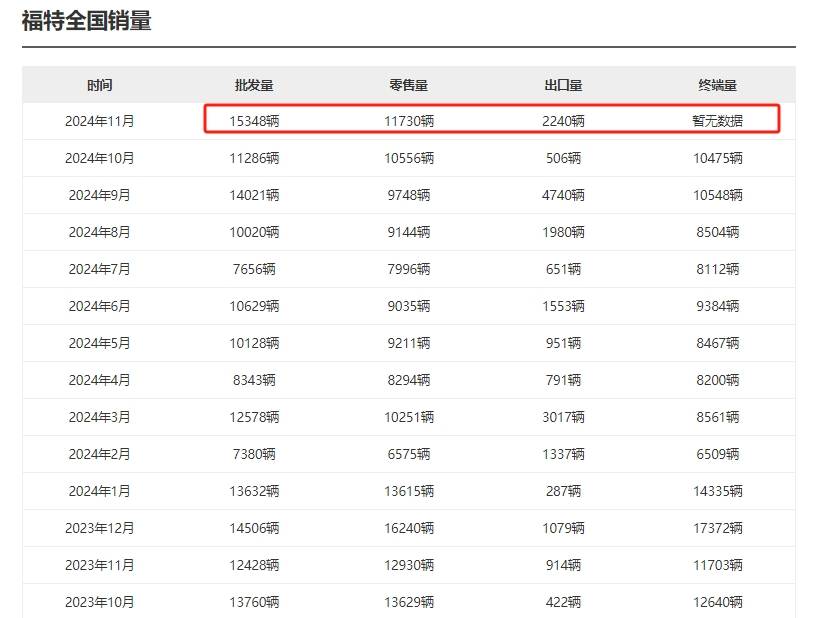 从长安汽车集团公布的产销快报中,长安福特 11 月销量为 25,103 辆,较去年同期增长 31.78%,2024 年 1-11 月累计销量为 217,340 辆,同比增长 6.00%,但这一数据相比其曾经的辉煌时期仍显得微不足道。与此同时,第三方平台的数据则显示,11月福特国内零售量为11730辆,批发量为15430辆,其中国内零售量方面,长安福特是同比下滑的,这一差异或许与统计口径有关,但无论如何,月销2万台左右的成绩都难以令人满意。