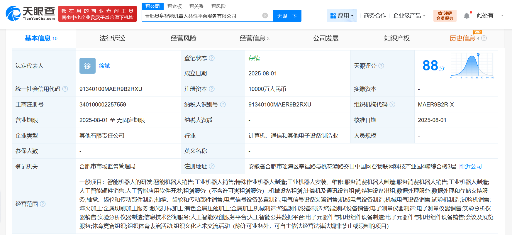 天眼查App显示,近日,合肥具身智能机器人共性平台服务有限公司成立,法定代表人为徐斌,注册资本1亿人民币,经营范围含智能机器人的研发、智能机器人销售、工业机器人销售、特殊作业机器人制造、服务消费机器人销售、计算机及通讯设备租赁、数据处理服务、数据处理和存储支持服务等。