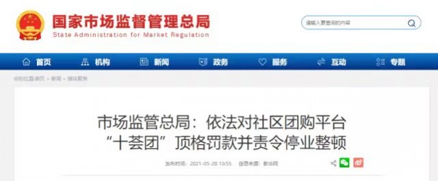 尴尬的是,就在“九不得”公布后,十荟团连续收到相关处罚。其中,在3月3日,市场监管总局先对十荟团等五家社区团购企业不正当价格行为,作出行政处罚。5月27日,市场监管总局又对十荟团(主体为北京十荟科技有限公司)处以150万元人民币顶格罚款,并责令“十荟团”平台江苏区域停业整顿3日。