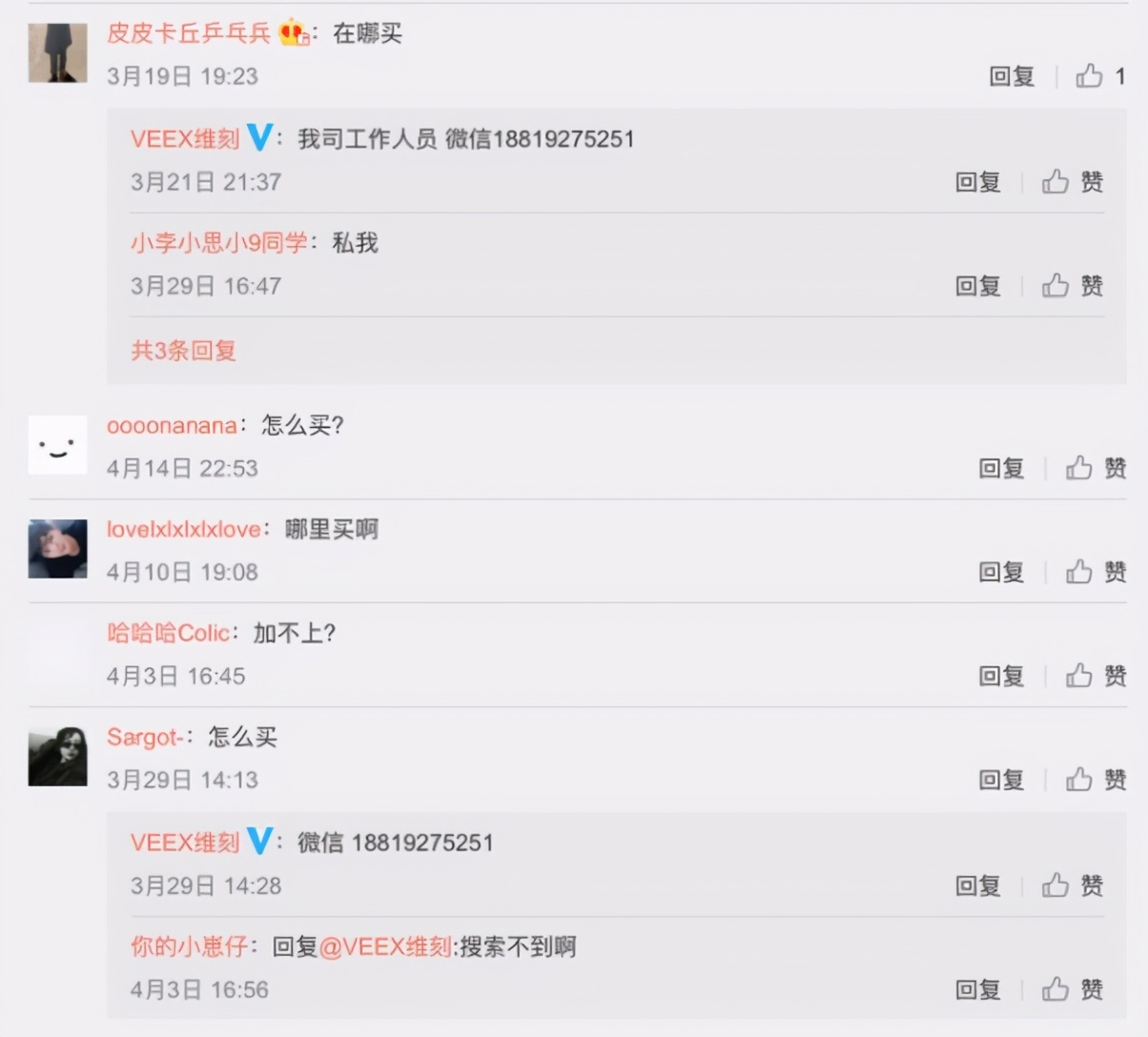 当有用户在评论区留言询问购买途径时,维刻VEEX官方微博更是直接给出微信联系方式,暗示用户可以通过线上购买。