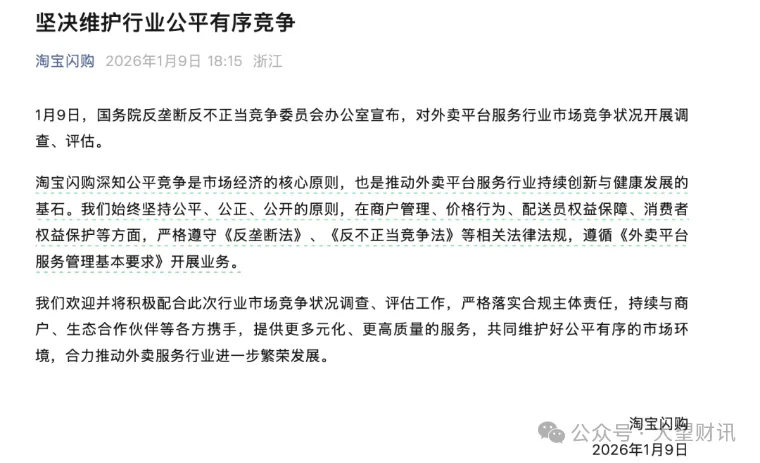 淘宝闪购方面公开发表声明,强调始终坚持公平公开原则,在商户管理、定价行为、骑手权益保障、消费者保护等方面严格遵守《反垄断法》《反不正当竞争法》,欢迎并将积极配合此次调查评估工作,携手各方维护公平有序的市场环境。