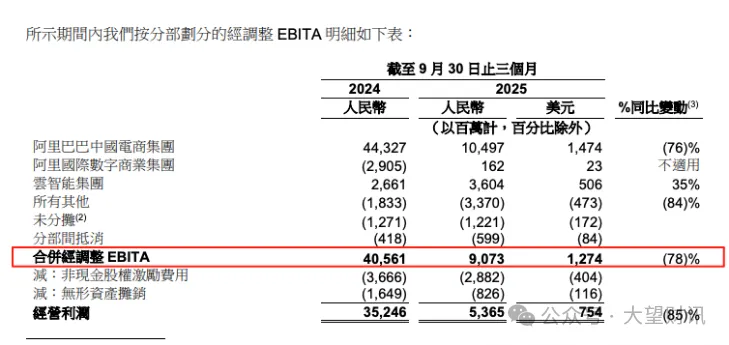 利润端的压力也更直观:阿里在业绩概要中披露,9月季度经调整EBITA同比下降78%至90.73亿元,并把下滑原因直接指向对即时零售、用户体验及科技的投入。