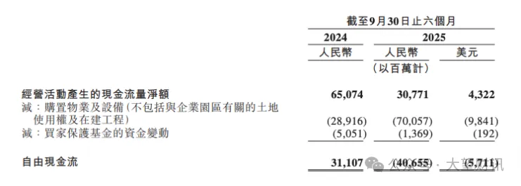 拉长到半年口径,截至2025年9月30日,阿里经营活动现金流净额307.71亿元,自由现金流净流出406.55亿元,同样点名“即时零售投入”。