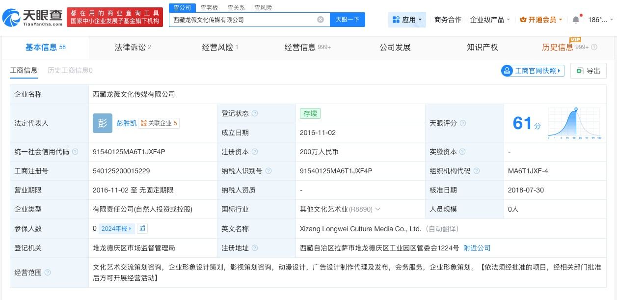 西藏龙薇文化传媒有限公司成立于2016年11月,法定代表人为彭胜凯,注册资本200万人民币,经营范围包括文化艺术交流策划咨询、企业形象设计策划、影视策划咨询等。股东信息显示,该公司由赵薇、孙丹分别持股95%、5%。