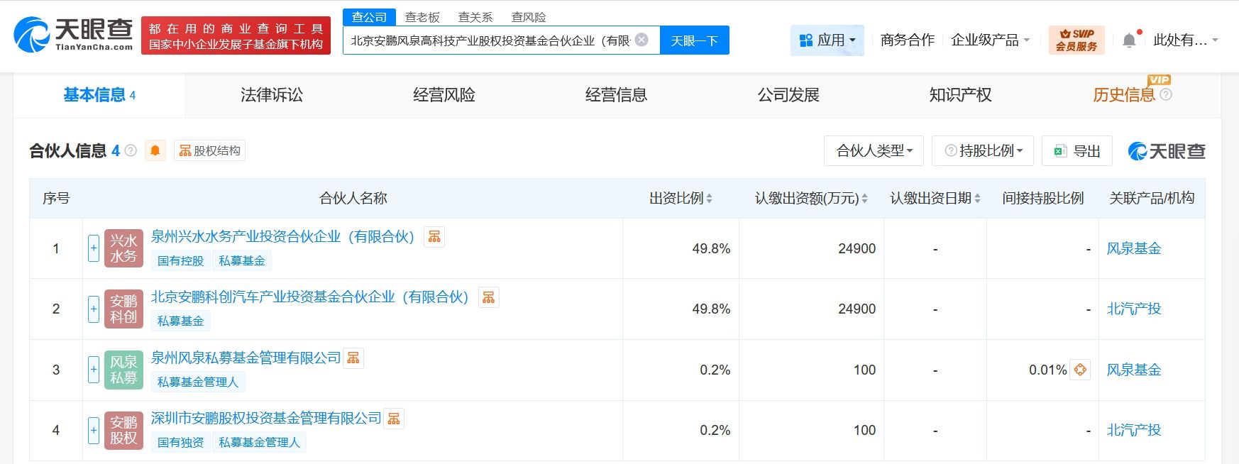 天眼查工商信息显示,近日,北京安鹏风泉高科技产业股权投资基金合伙企业(有限合伙)成立,执行事务合伙人为泉州风泉私募基金管理有限公司、深圳市安鹏股权投资基金管理有限公司,出资额5亿人民币,经营范围为私募股权投资基金管理、创业投资基金管理服务。合伙人信息显示,该基金由泉州兴水水务产业投资合伙企业(有限合伙)、泉州风泉私募基金管理有限公司以及北汽旗下北京安鹏科创汽车产业投资基金合伙企业(有限合伙)、深圳市安鹏股权投资基金管理有限公司共同出资。