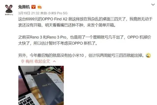 其实现在关于OPPO FInd X2系列大家讲什么的都有,整体上看大家认可这款机型的表现,但对于售价都感觉有点高了。就在近日魅族前员工称:OPPO Find X2 Pro已经到手好几天,但竟然没有开箱。这不重点,重点是他称之前也买过OPPO Reno 3与Reno 3Pro,但只用了一个星期出就掉了。关键是出这两款手机赔了几千,因此他得出OPPO的手机掉价太快了,暂时不会考虑OPPO的新机了。划重点:后悔没有抢小米10,估计玩两周亏三四百就能出掉。这是称小米比OPPO保值吗?