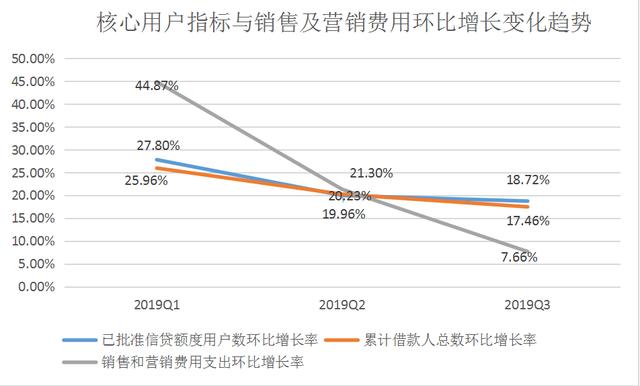 不过,营销支出的增速也在放缓。根据360金融财报提供的数据,360金融的销售和营销费用支出环比增长率从44.87%降到了7.66%,其核心用户指标例如已批准信贷额度用户数、累计借款人总数环比增长率也分别从27.8%、25.96%下降到了18.72%、17.46%。