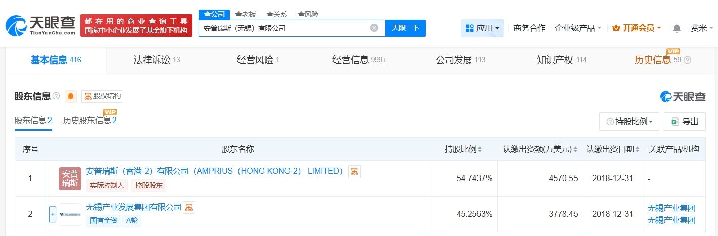 安普瑞斯(无锡)有限公司成立于2014年11月,法定代表人为徐子福,注册资本8349万美元,经营范围包括电池系统管理软件技术的研发、提供新材料技术推广服务、经济贸易咨询等,由无锡产业发展集团有限公司及安普瑞斯(香港-2)有限公司(AMPRIUS(HONG KONG-2) LIMITED)共同持股。