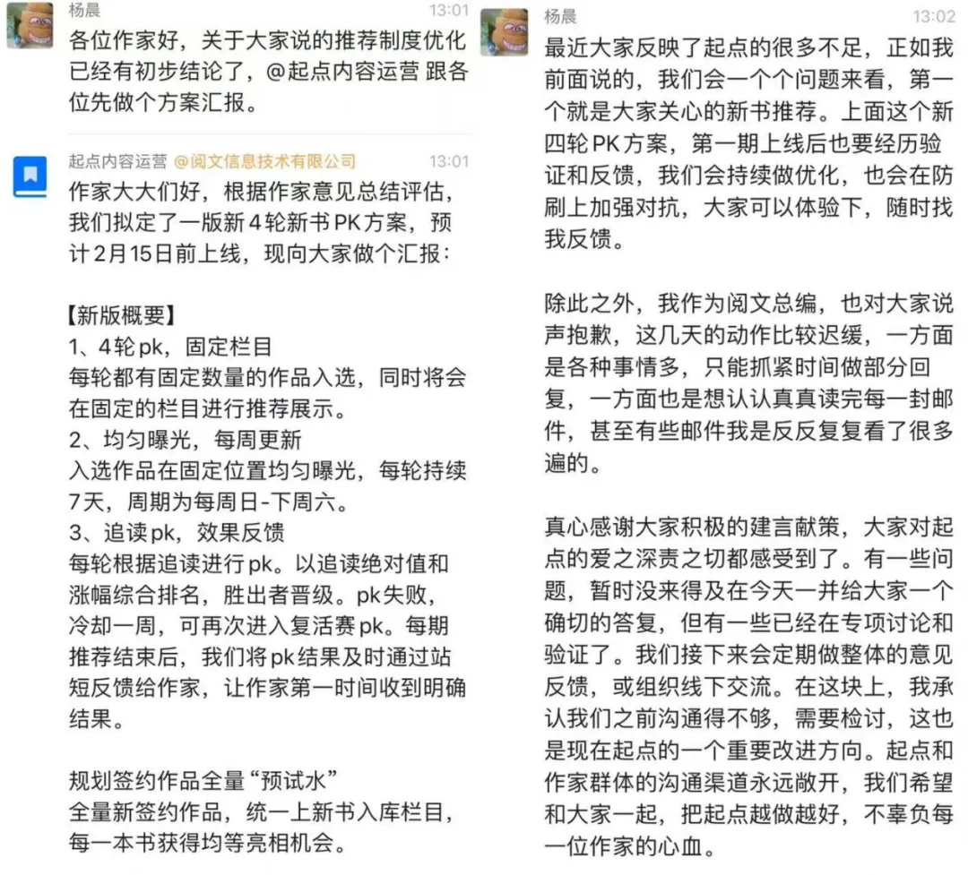 在舆论压力下,阅文副总裁、总编辑杨晨出面与作者沟通态度相当诚恳,提供了邮件作为直接沟通渠道,不少作者晒出了与他的交流记录。很快,起点给出了最终解决方案,恢复了原先的推荐机制,并对此前的争议做出了道歉。