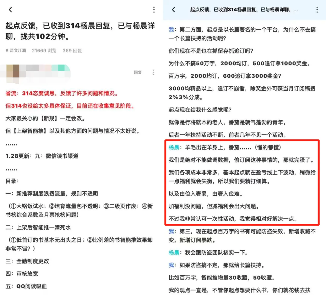 沟通中,有创作者提出“起点为何不能像番茄一样多搞扶持活动”的疑问,杨晨表示“羊毛出在羊身上”,并强调起点“绝对不能做调数据、偷订阅这种事情”。同时,他还强调了起点各项成本高企,运营就在盈亏线上下波动,因此必须精打细算。