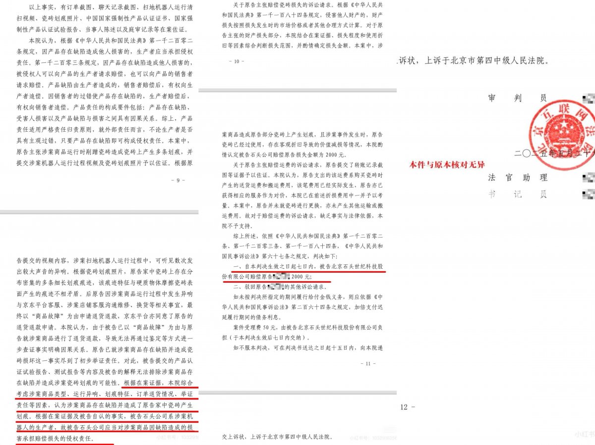一审法院表示,石头科技虽提交国家强制性产品认证实验报告等证据,主张涉事产品合格、接触地面部件为软性材质,但未能充分举证排除其产品与戴先生家中地砖划痕之间的因果关系。而戴先生提交的机器人运行视频、地砖划痕照片、取证记录等证据,能够确认涉事石头P10S Pro扫地机器人运行时的旋转轨迹与地砖圈状划痕高度吻合,可认定该机器人存在产品缺陷,且该缺陷是造成地砖划痕的直接原因。综上,北京互联网法院一审判决石头科技赔偿戴先生2000元。