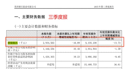 受到宏观经济的影响,贵阳银行的财报出现了营收和净利润一同下降的情况。根据贵阳银行2025年半年报,该行在报告期内实现营业收入65.01亿元,同比下降12.22%,到了三季度之后,下降的情况没有恢复,2025年前三季度累计营业收入是94.35亿元,同比下降幅度扩大到13.73%。但是结合整个银行业来看,营收和净利润一同下滑,不是它一家独有的情况,而是净息差收窄环境的一个缩影。因为在当下的低利率时代,银行曾经依靠息差盈利的传统模式已经不再适用,并且这种下行的趋势并不是暂时性的波动,而最后的就是倒逼管理者要开始进行结构性调整。