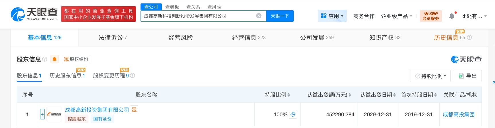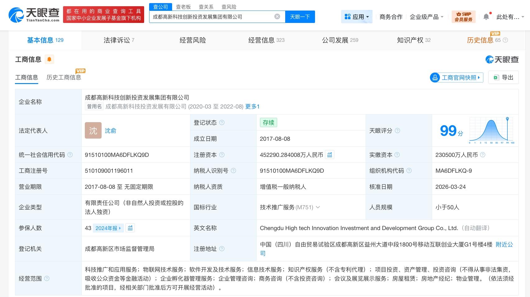 该公司成立于2017年8月,法定代表人为沈俞,经营范围包括科技推广和应用服务、物联网技术服务、软件开发及技术服务、信息技术服务、知识产权服务、项目投资、资产管理等。股东信息显示,该公司由成都高新投资集团有限公司全资持股。