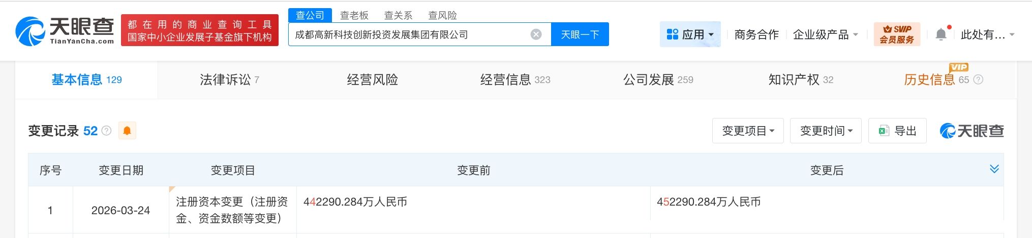 天眼查工商信息显示,近日,成都高新科技创新投资发展集团有限公司发生工商变更,注册资本由约44.2亿人民币增至约45.2亿人民币。