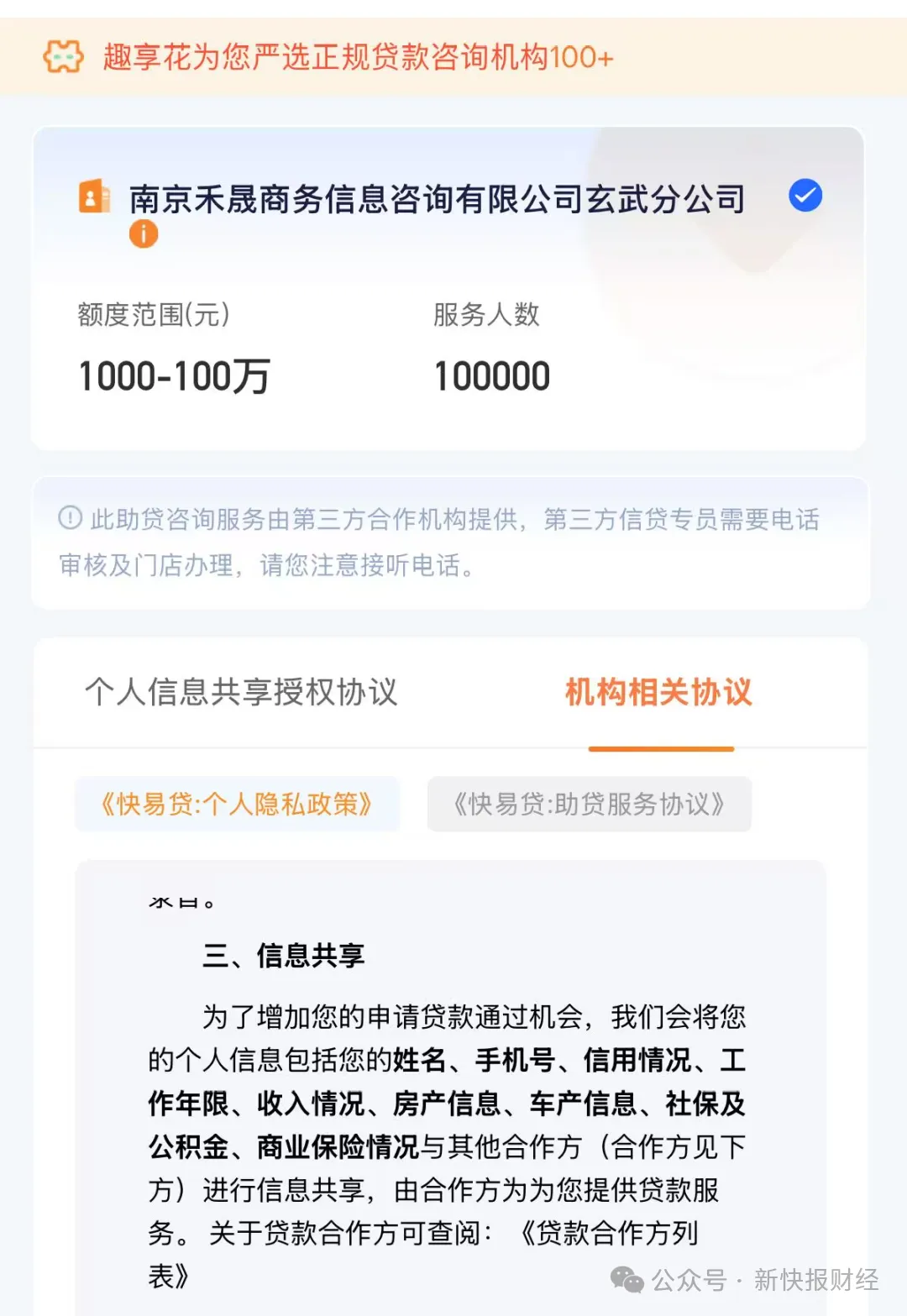 然而,用户留在趣享花平台的个人信息,经过导流第三方中介后,还会继续被共享流转。比如,在趣享花导流的下游贷款中介南京禾晟商务信息咨询有限公司玄武分公司相关协议中,约定“为了增加用户的申请贷款通过机会,其会将用户的个人信息,包括姓名、手机号、信用情况、工作年限、收入情况、房产信息等,与其他合作方进行信息共享”。