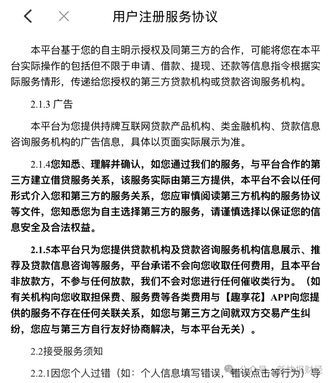 根据趣享花注册服务协议,平台合作第三方包括第三方金融服务方、持牌互联网贷款产品机构、类金融机构、贷款信息咨询服务机构等。然而在实际业务中,趣享花导流了第三方贷款中介。