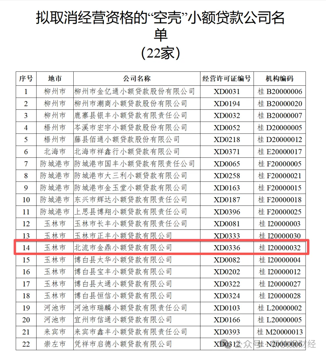 2023年11月,广西壮族自治区地方金融监督管理局发布关于拟取消部分小额贷款公司经营资格名单的公示,公示信息显示,经各级地方金融监管部门逐级核实并结合自治区地方金融监管局历年现场检查和年度考评结果,现有22家小额贷款公司属“空壳”状态。经研究,拟取消22家小额贷款公司的经营资格。这其中就包括北流市金鼎小额贷款有限公司。