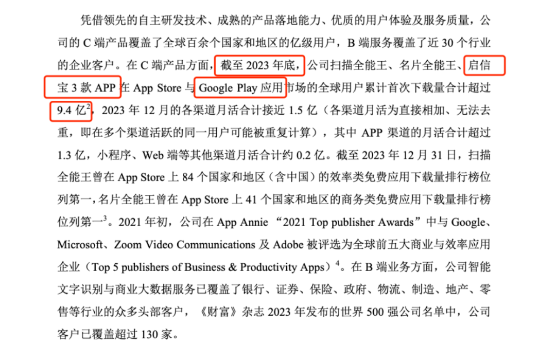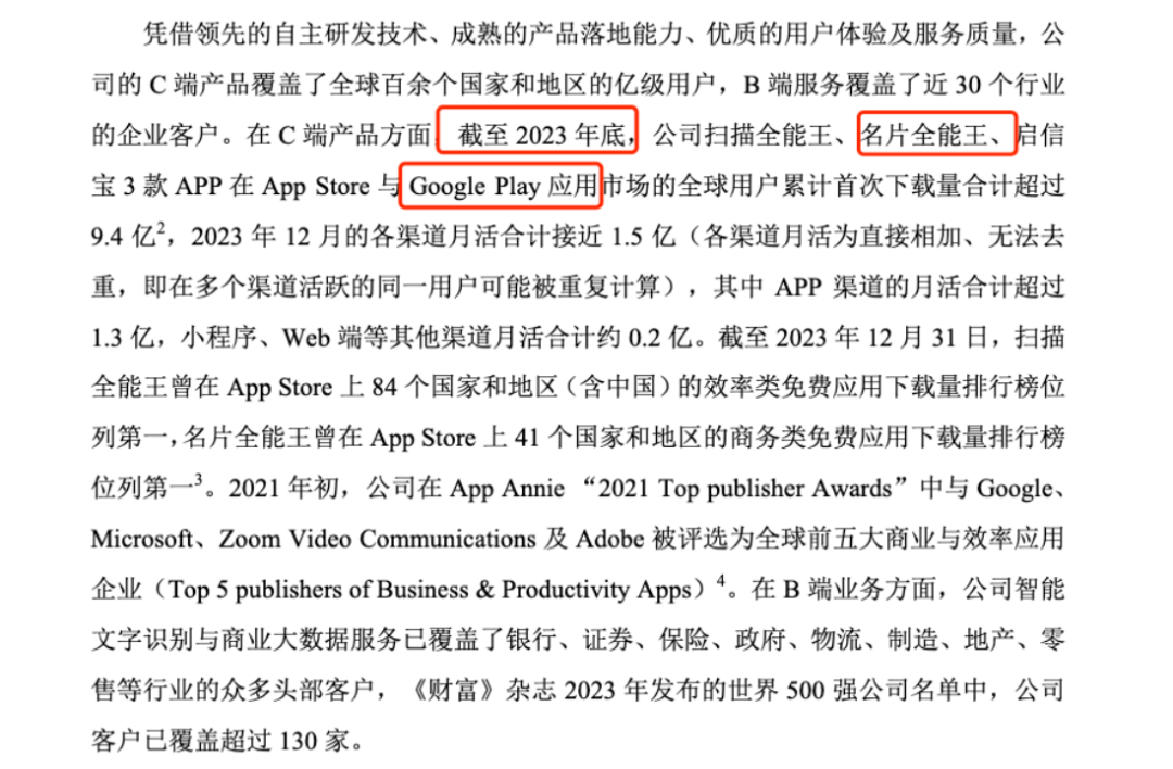 合合信息招股意向书披露,合合信息凭借其领先的自主研发技术、成熟的产品落地能力以及优质的用户体验和服务质量,其C端产品已覆盖全球超过一百个国家和地区的数亿用户,同时B端服务也已渗透至近30个行业的企业客户中。截至2023年底,合合信息旗下的扫描全能王、名片全能王、启信宝三款APP在全球范围内的App Store与Google Play应用市场的累计首次下载量超过了9.4亿次。此外,2023年12月期间,这些产品的各渠道月活跃用户数总计接近1.5亿,其中APP渠道的月活跃用户数超过1.3亿,而小程序、Web端等其他渠道的月活跃用户数约为0.2亿。