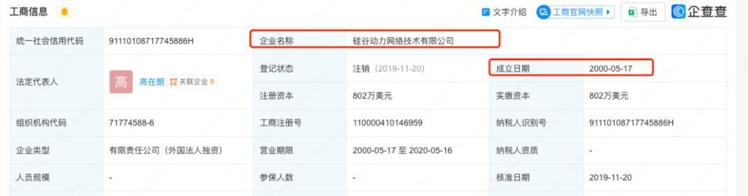 然而,根据企查查搜索结果显示,硅谷动力网络技术有限公司的实际成立时间为2000年。这意味着,按合合信息招股书意向书的时间线,黄国强似乎在该公司成立前的三年就已经在其任职,直至2000年硅谷动力网络技术有限公司成立当年黄国强才离开。