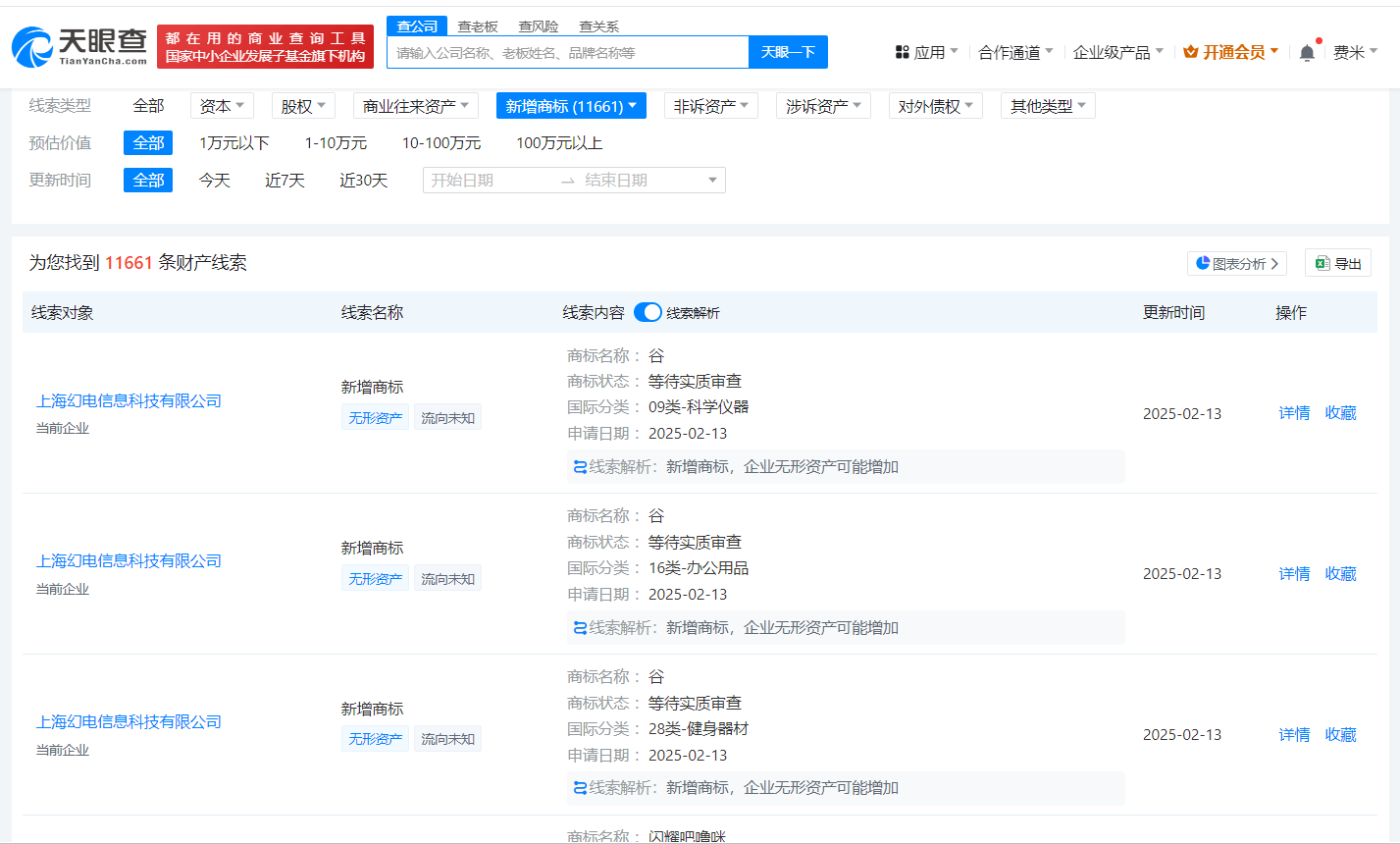 天眼查财产线索信息显示,近日,B站关联公司上海幻电信息科技有限公司申请注册多枚“B谷”商标,国际分类为办公用品、科学仪器、健身器材,当前商标状态均为等待实质审查。