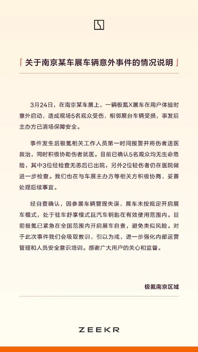 3月24日,在2024南京国际新能源汽车展览会上,一辆极氪X展车启动并撞向隔壁比亚迪展台,车辆受损同时也有人被撞倒,其中包括一名小孩。