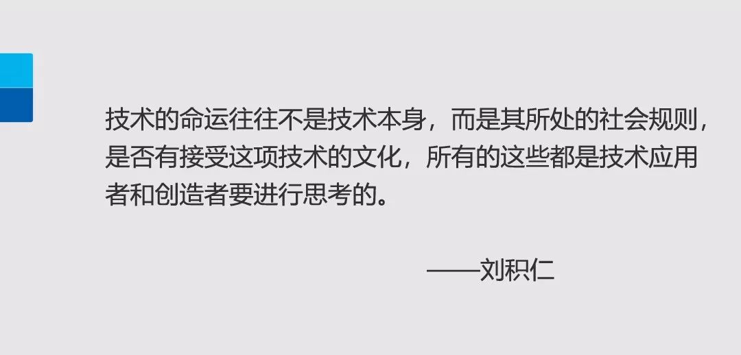 “任何一个技术的成长都需要土壤,就像农民的种子撒在地上,能不能长出作物,不仅取决于你多辛勤,很多时候跟环境有很大的关系。所以生态是使技术变成价值的土壤,对于生态的认识更是对社会发展趋势的认识,更是对我们自身的认识,以及对我们技术创造价值的空间的认识。”——刘积仁