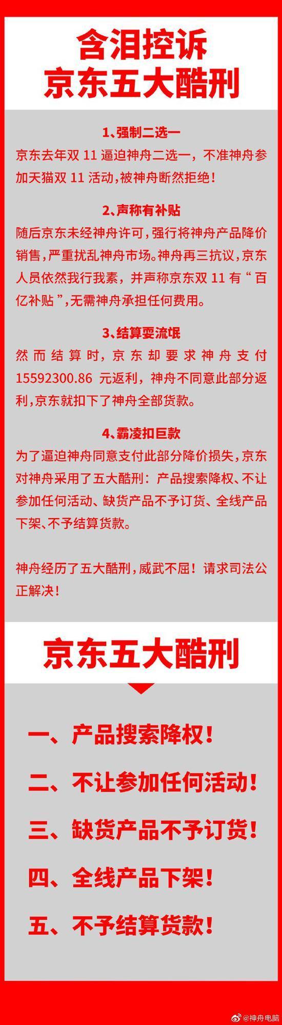 2月21日,神舟电脑再次发声,指京东不予结算货款之外,自双方合作以来还多次遭遇京东强制二选一、产品搜索降权等“五大酷刑”。